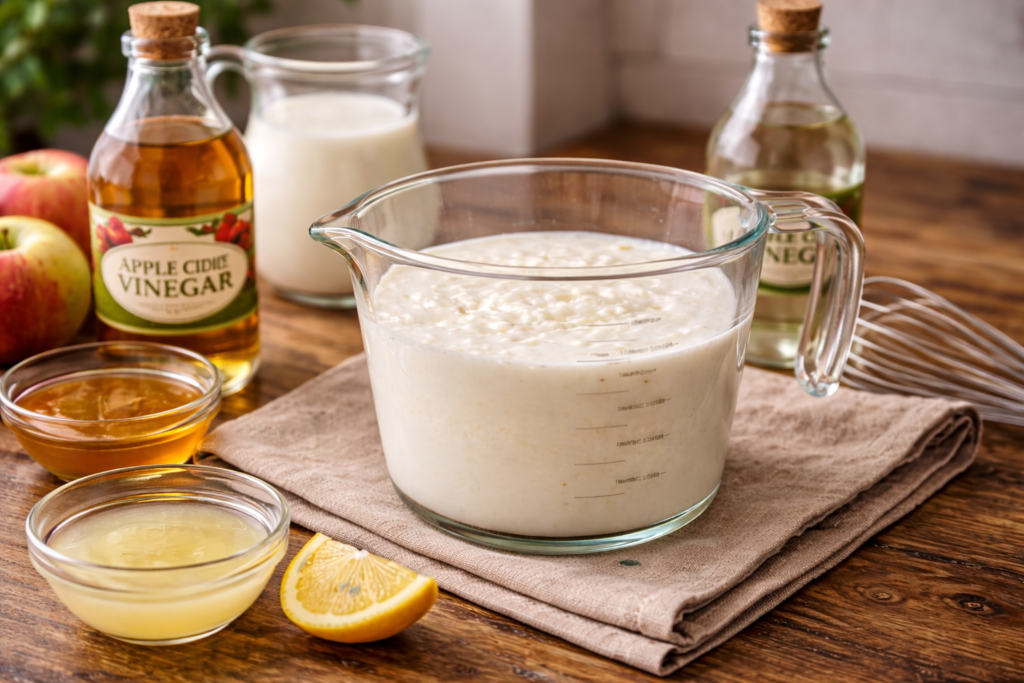 There’s a third category worth knowing: naturally clabbered raw milk. Unpasteurized milk left at room temperature will sour through the action of naturally present lactobacillus bacteria, producing a thickened, fermented product that genuinely resembles old-world cultured dairy. Traditional soda bread recipes, Amish baking, and certain regional breads historically called for exactly this. However, the quick-acid method described below replicates its baking function reliably without the food safety complexity of raw milk handling.