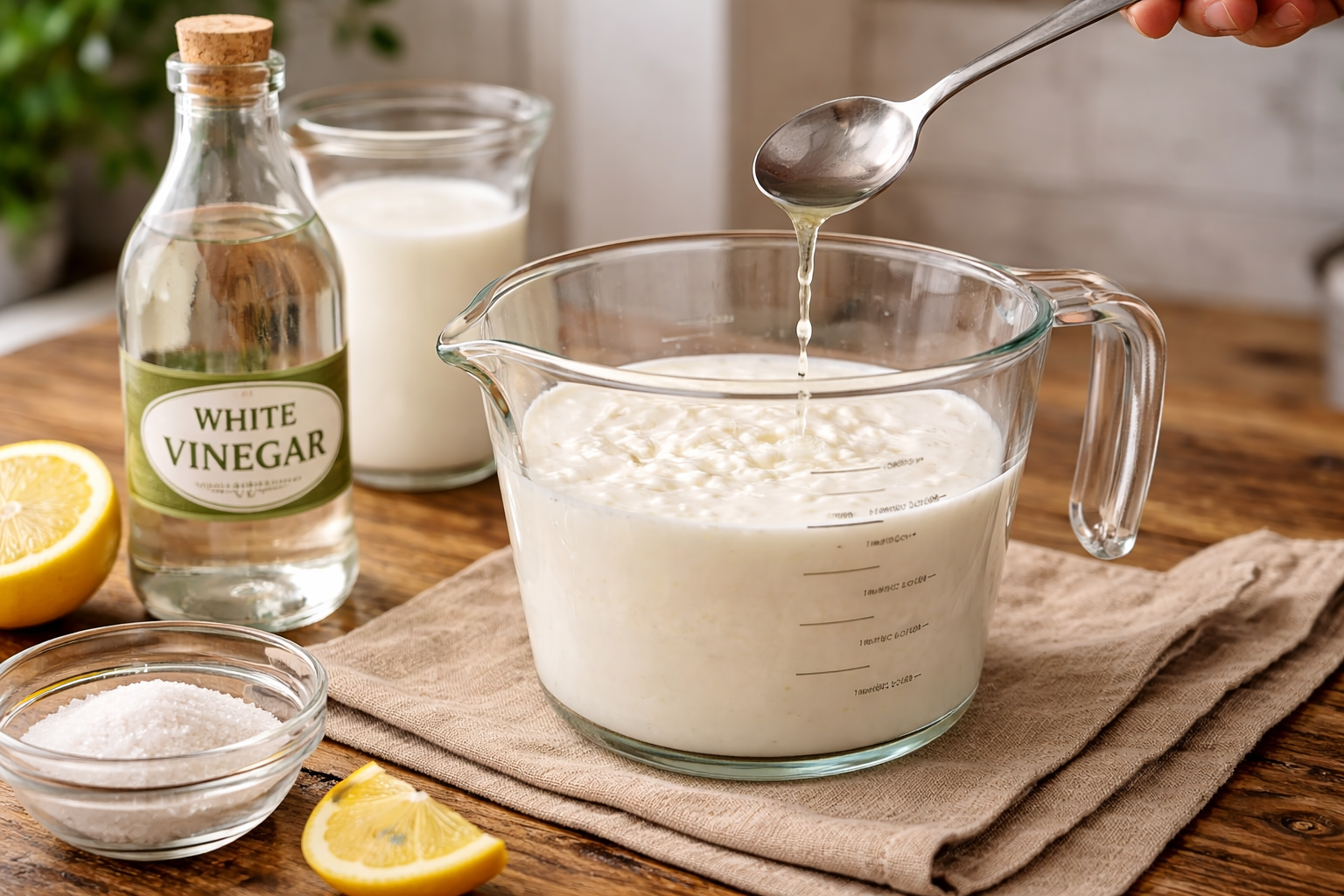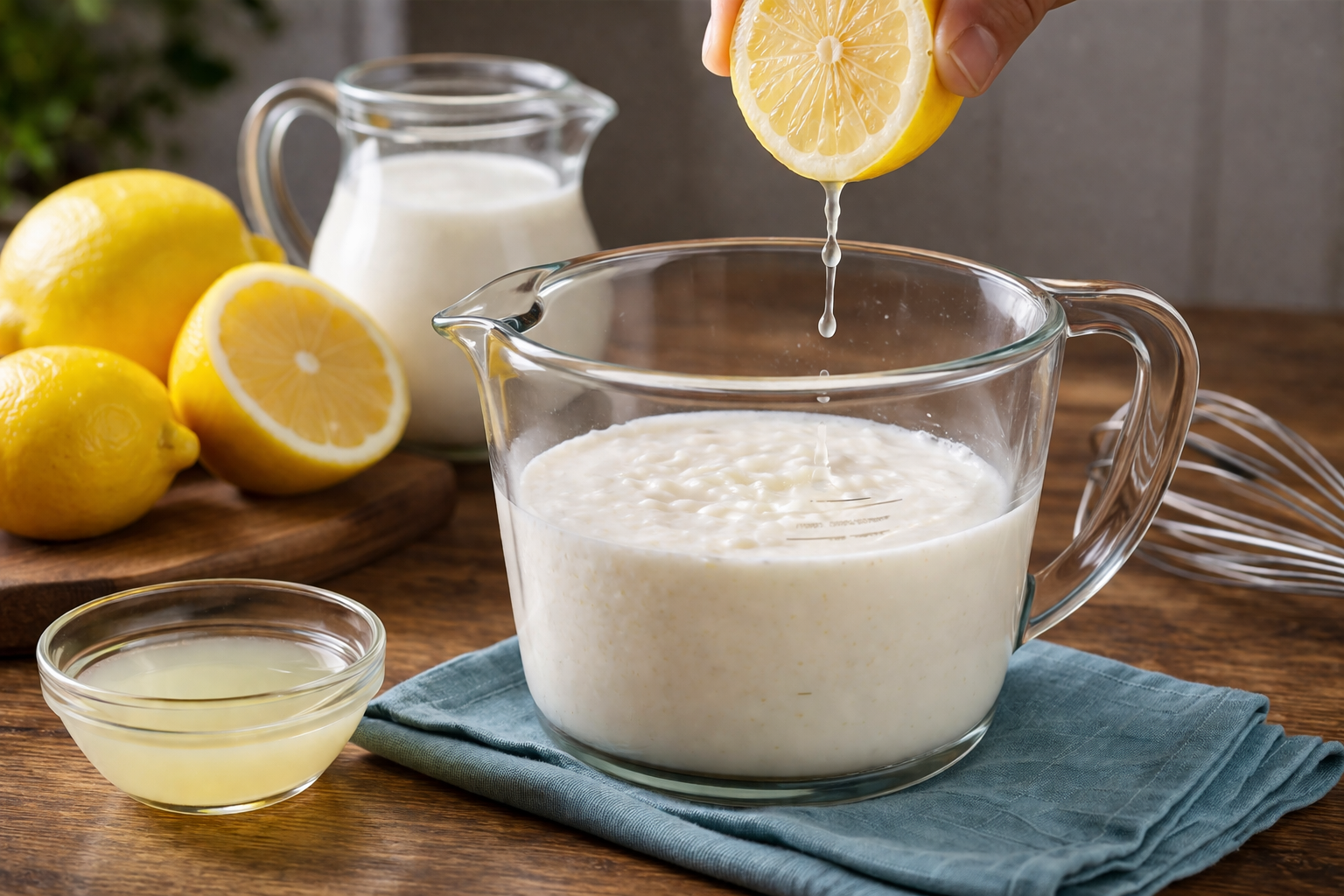 One note on lemons: bottled lemon juice works, but fresh-squeezed gives a cleaner acid without the slight preservative taste that sometimes comes through in concentrated bottled versions. For high-acid recipes where the volume is small (¼ cup sour milk), the difference is negligible. For larger volumes, fresh is worth the extra thirty seconds.