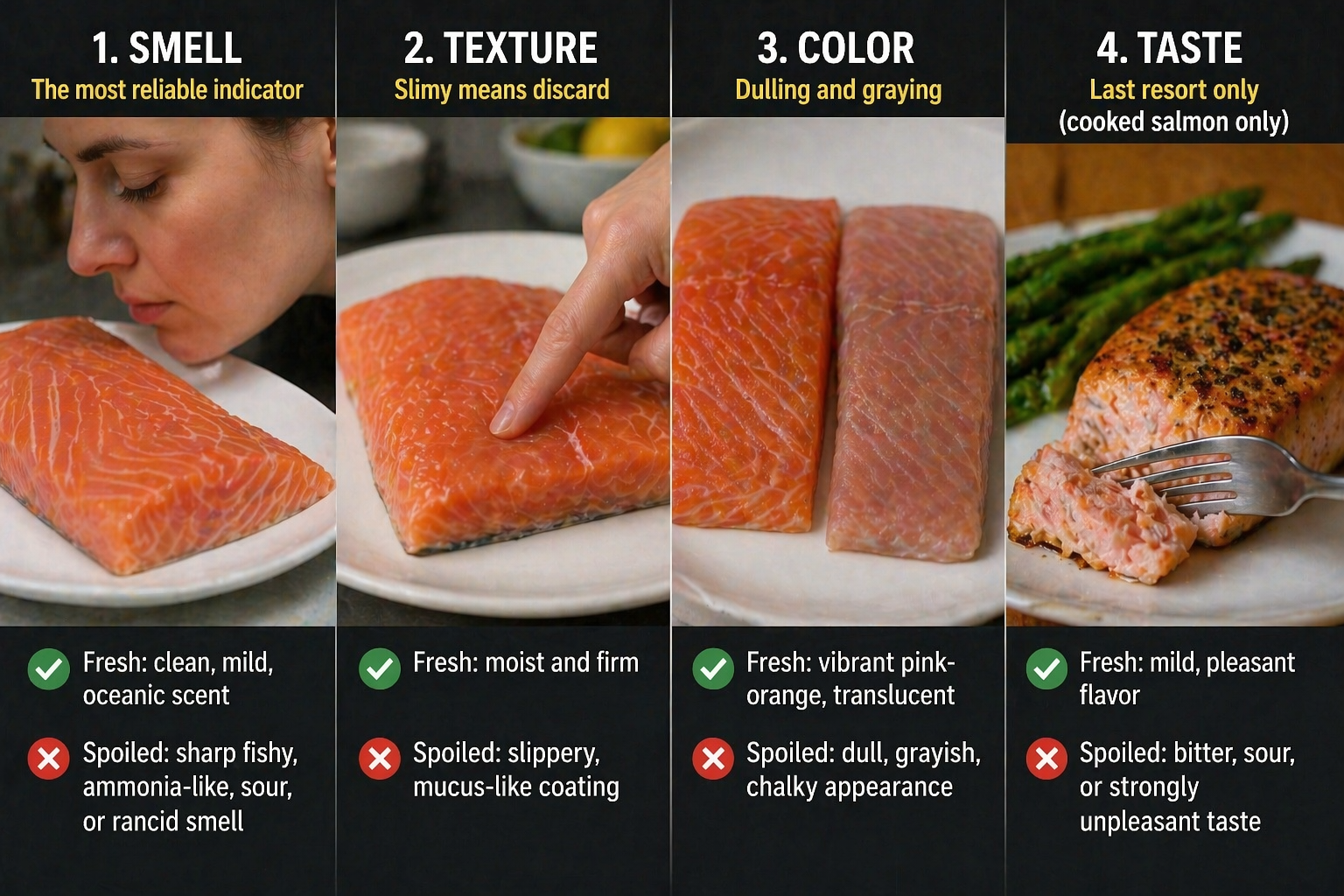 Unlike the sushi context where tasting can be dangerous before you detect a problem, with salmon that has been cooked the taste-test is more acceptable as a final confirmation. Rancid or spoiled cooked salmon tastes distinctly off — bitter, sour, or strongly unpleasant. But do not rely on taste as a primary indicator, and never taste raw salmon that you’re uncertain about.