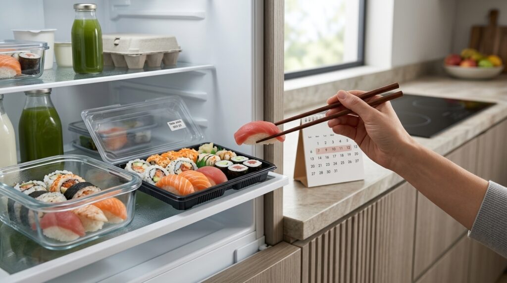 For store-bought sushi, the practical guidance is: eat it the same day. The labeled date tells you the last safe day, not the optimal day.