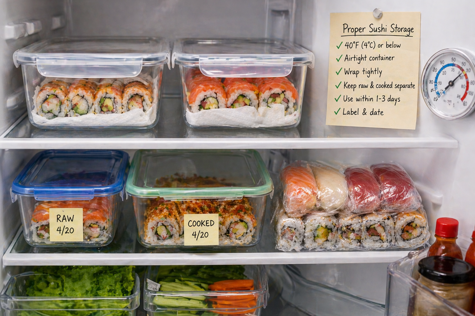 Temperature: Store sushi at 40°F (4°C) or below. Most home refrigerators run warmer than their dial suggests — the actual temperature varies by location within the fridge. The coldest consistent zone is typically the back of the middle shelf, away from the door. The fridge door is the warmest zone due to frequent opening; never store sushi there.
