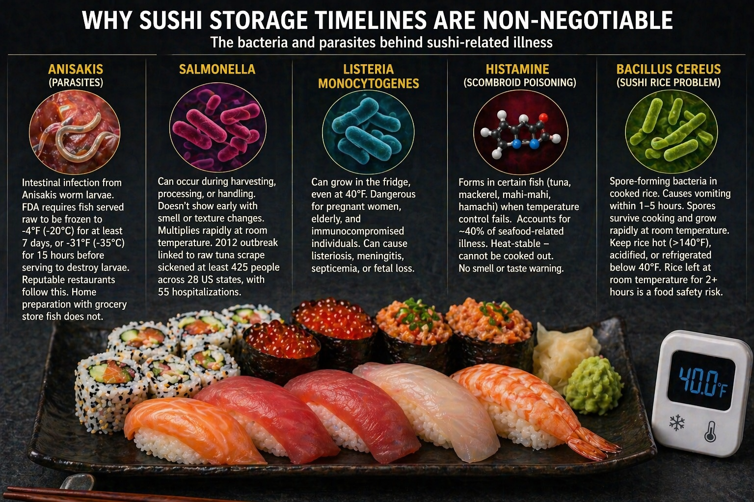 The bacteria and parasites associated with sushi — Anisakis, Salmonella, Listeria, histamine-forming organisms, Bacillus cereus in the rice — are not theoretical concerns. They have caused real, documented outbreaks with hundreds of victims. The storage guidelines exist because the science of bacterial growth at various temperatures is well established, not because regulators are being conservative.