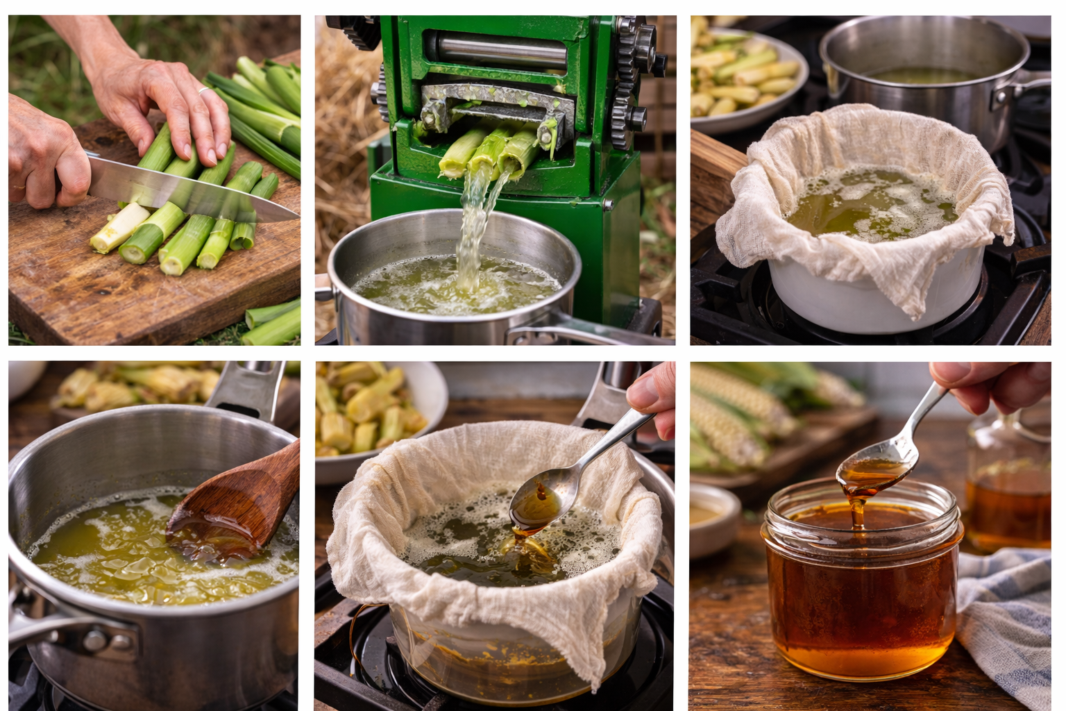 - Higher-efficiency method: Run stalks through a sugarcane press or a juicer — this extracts significantly more liquid per batch.